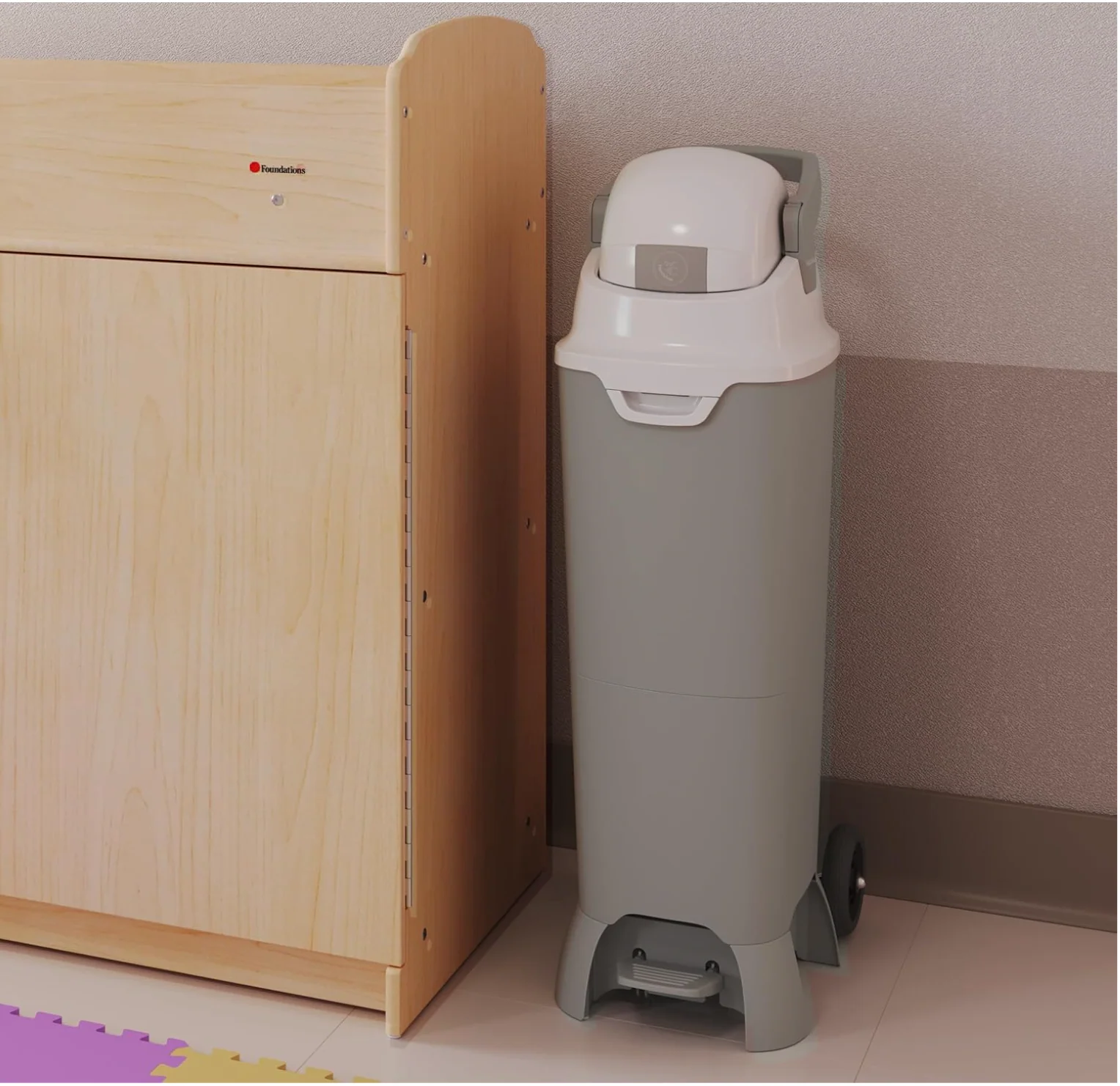 A PLUS modellünk kerekekkel felszerelt, így könnyedén mozgatható a különböző pelenkázóhelyek vagy a hulladéktárolók között.