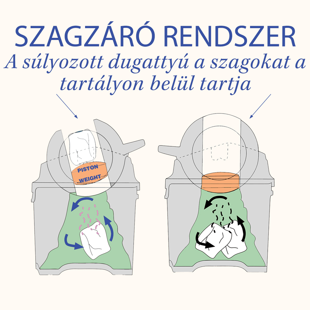 A súlyozott dugattyú és a precíz tömítések megakadályozzák a szagok és baktériumok kijutását, így a pelenkázóhelyiség friss és higiénikus maradhat.