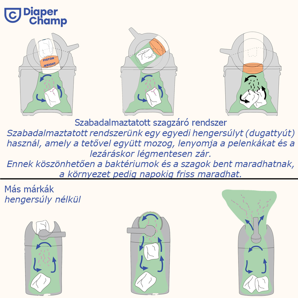 A DiaperChamp egyedülálló, súlyos hengermechanizmussal működik, amely a pelenkát a tartályba nyomja, miközben légmentesen lezárja a nyílást.