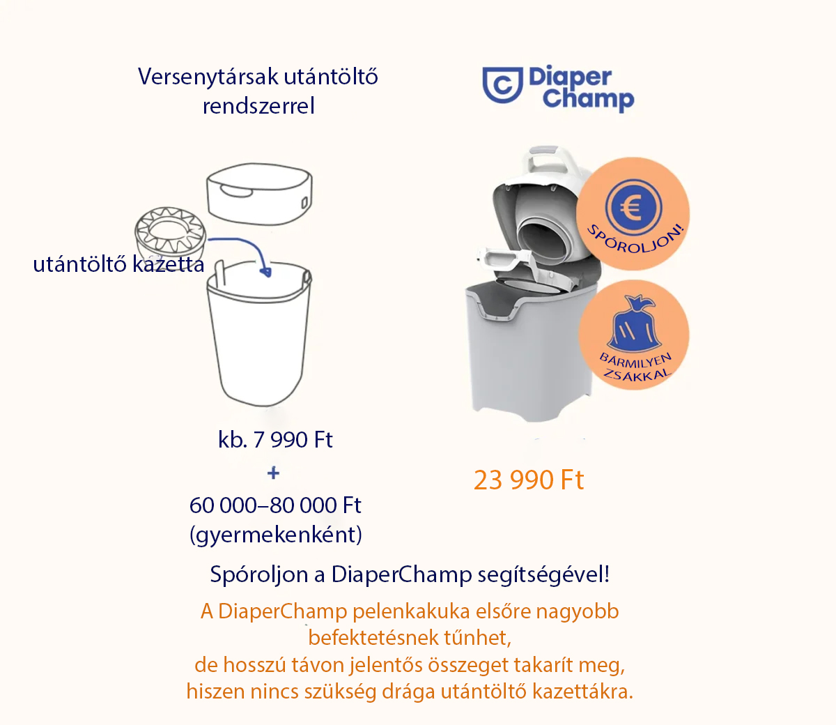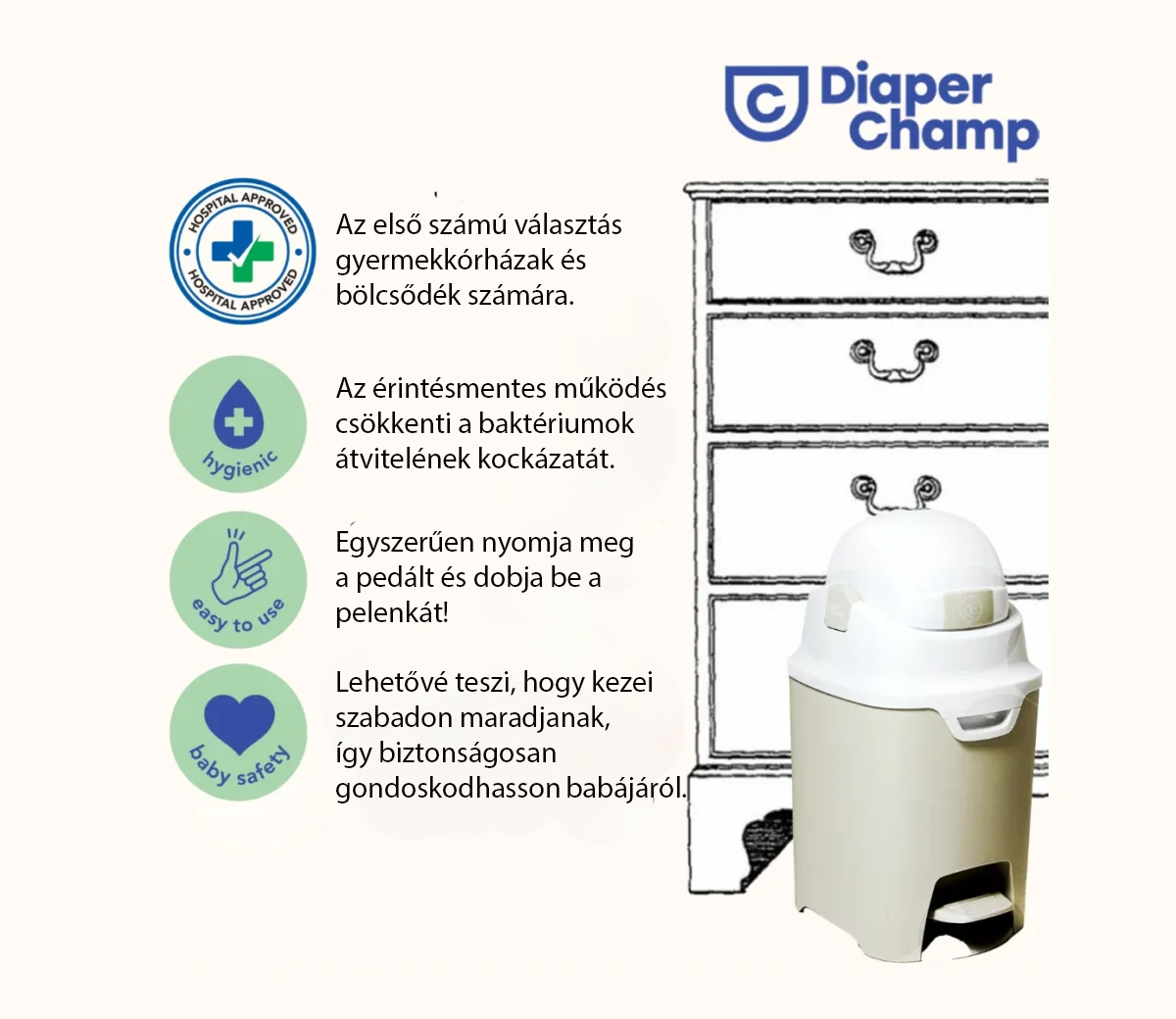 A DiaperChamp termékeivel kórházi és bölcsődei használatra is jóváhagyott, prémium minőségű pelenkakukát kap, amely szabadalmaztatott szagzáró rendszerrel működik, mindezt fix áron, rejtett költségek nélkül.